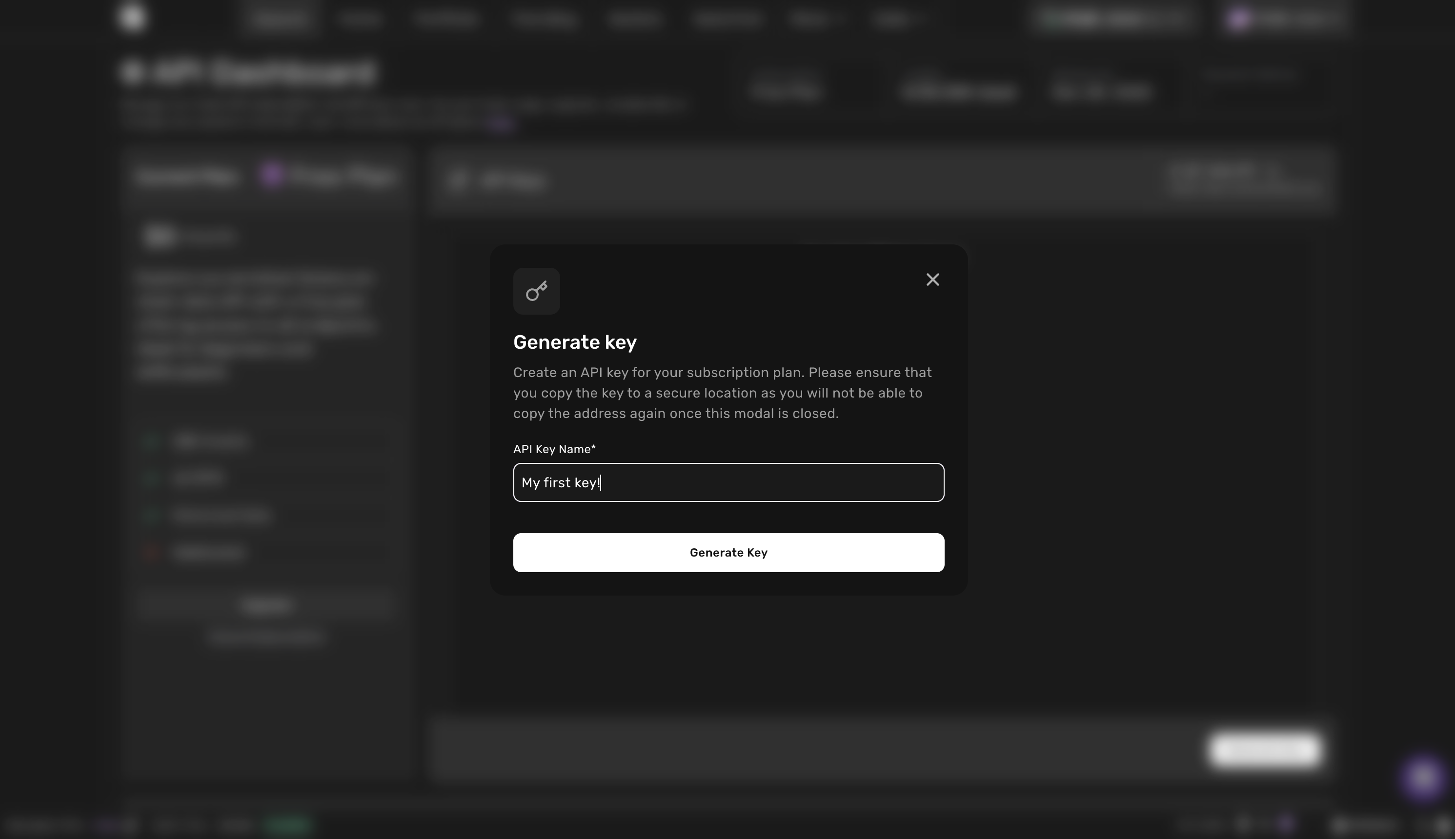Click on the "Generate Key", and a modal will appear where you can name and create your key. Make sure you copy your key somewhere secure first before continuing. Once the modal is closed, you will not be able to copy your API key again and will need to recreate one. The Vybe API URL will also be visible once a key is created.